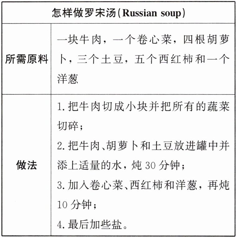 根据下面的表格提示写一篇英语短文,介绍一下罗宋汤的做法,不少于80词,可适当发挥。