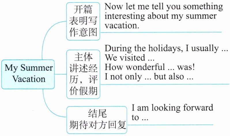 1.主题词块①take sb’s breath away②ready to do sth③get together ④in the sun⑤turn around ⑥look for⑦something interesting⑧during the holidays2.句型仿写①How wonderful the experience was!②The scenery was so amazing that it took my breath away.【连句成篇】Dear Andrew,I am glad to receive your email. Now let me tell you something interesting about my summer vacation.During the holidays, I usually read books, play sports and travel with my family. This summer vacation, I had an unforgettable trip to Beijing. We visited the Great Wall, the Palace Museum and the Summer Palace. The scenery was so amazing that it took my breath away, and I learnt a lot about Chinese history and culture. How wonderful the experience was! I not only had fun but also gained knowledge.I am looking forward to hearing about your holiday experiences. Please write back soon!Yours,Li Ming