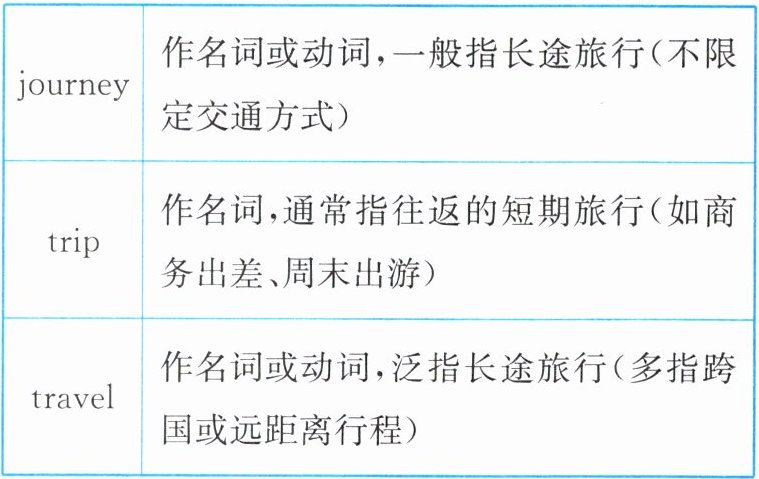 ,意为“去旅行”。journey也可作动词,意为“②旅行