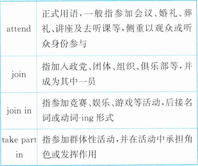 ”,其宾语通常为 concert、meeting、lecture 等。(2) attend,join,join in 与 take part in 的用法辨析