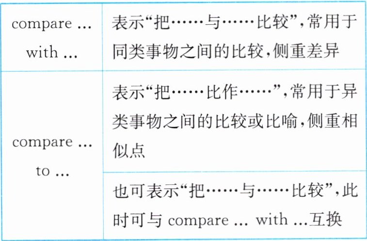 ”,常与介词 with/to 搭配使用。(2) compare... with... 与 compare... to... 的用法辨析