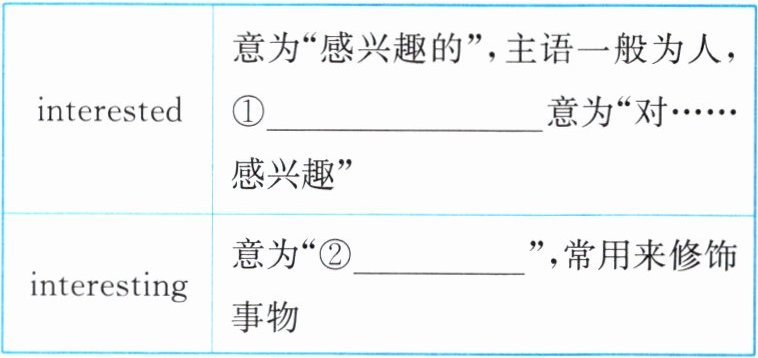 ”,也可作动词,意为“使感兴趣”。(2) interested 与 interesting 的用法辨析
