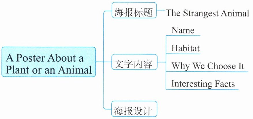 任务情境:假如你们是学校自然探索俱乐部的成员,任务是研究和展示世界上最奇特、最美丽或最有趣的动植物。每个小组将选择一种动物或植物,通过制作海报来展示它的独特之处。你们的目标是把图片和文字结合,让同学们对这种动物或植物有更深的了解,并激发他们对自然的热爱。请通过网络或书籍查找相关资料,运用本单元所学知识,参考下面的思维导图,制作一张海报。