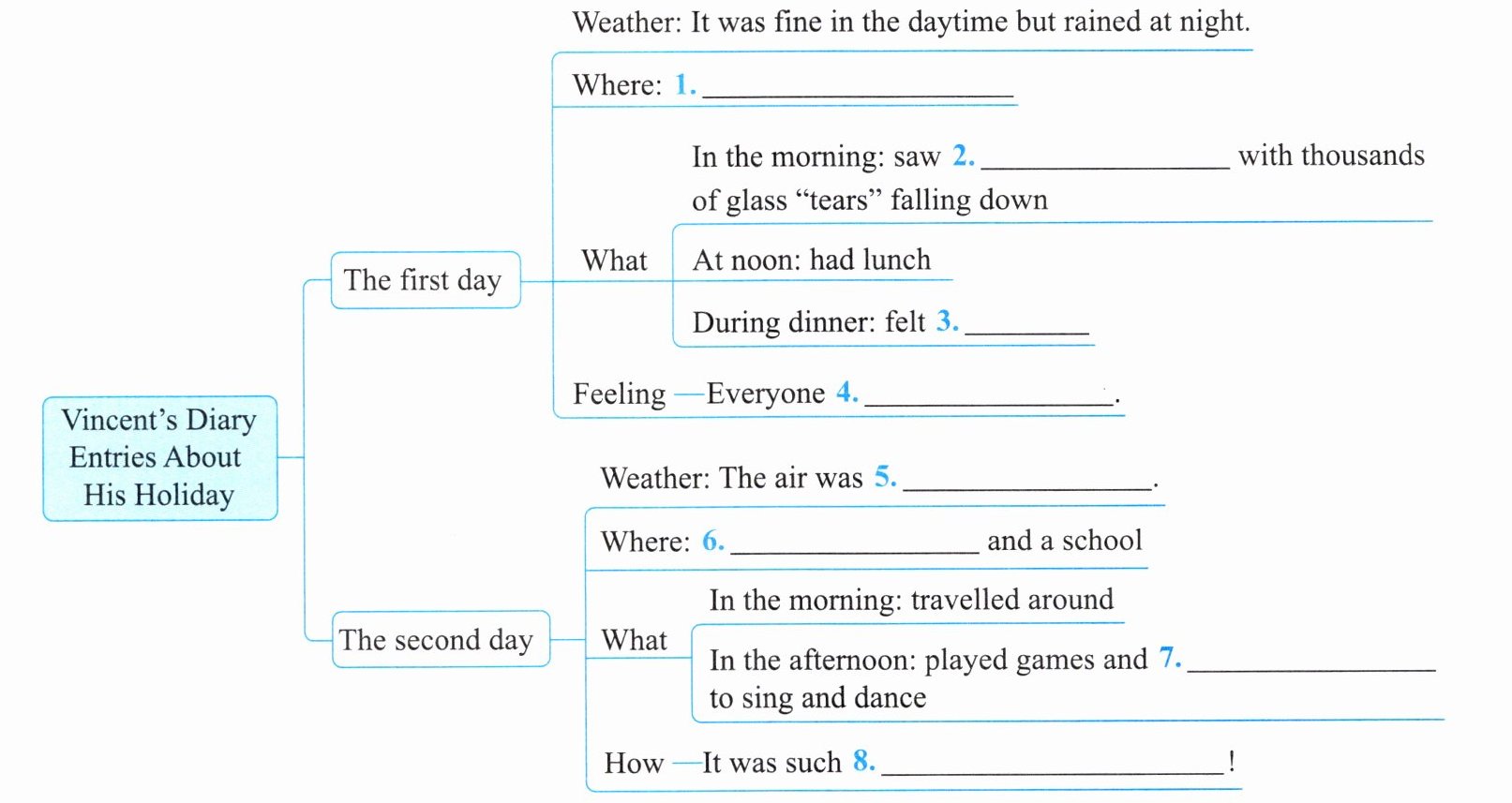 3. sick 4. felt excited 5. fresh and cool