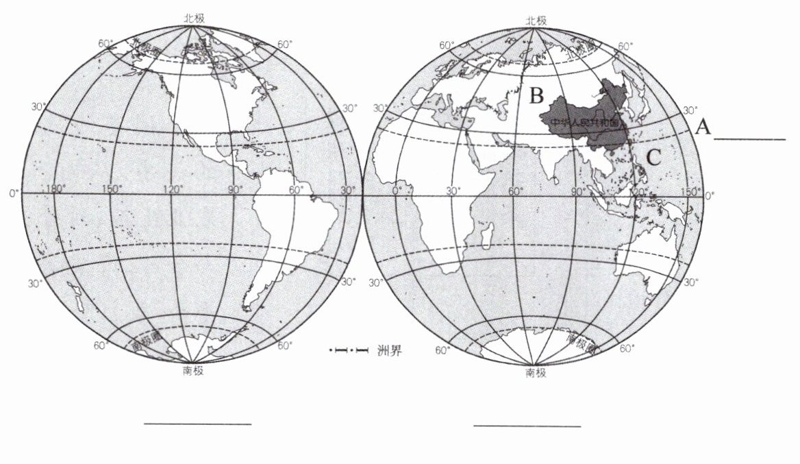 3. 海陆位置:我国位于世界最大的大陆——______大陆(B)的东部、世界最大的大洋——______洋(C)的西岸,海陆兼备。