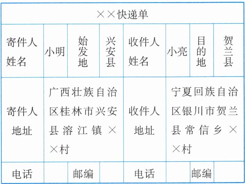 我国快递产业发展迅速,方便了人们的生活。读小明给小亮快递物品时所写的快递单,回答1~2题。