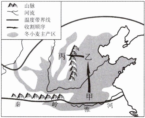 10. 影响冬小麦收割顺序由甲→乙、乙→丙的主要自然因素分别是(