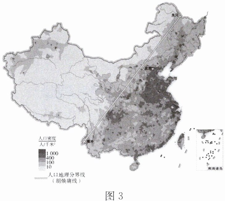 小筱同学找到了中国人口的分布图(图 3),通过该图探究下列问题。