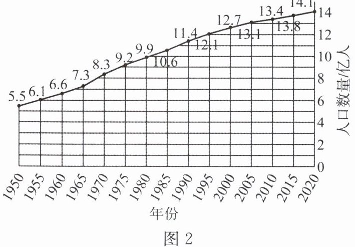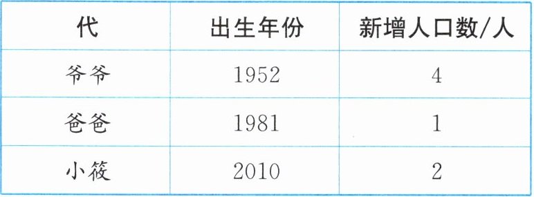下表是小筱同学第一次调查的她自己家族三代父系新增人口数量;图 1 是小筱同学第二次调查的全年级学生各自家族三代父系新增人口数量变化统计图;图 2 是我国 1950—2020 年人口增长(不包括香港、澳门特别行政区和台湾省人口数)图。