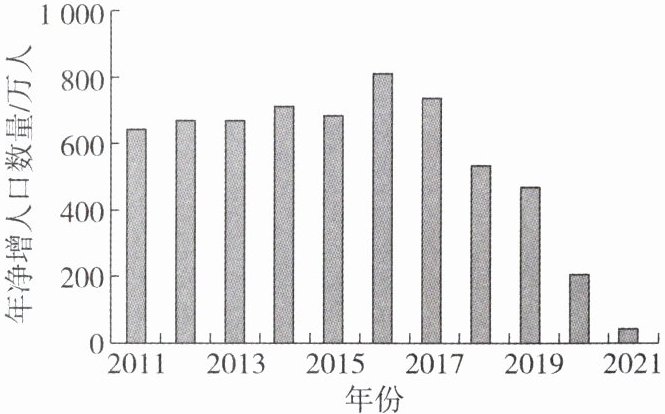 我国的年净增人口数主要是当年出生人口数减去当年死亡人口数。读 2011—2021 年我国年净增人口数(不包括香港、澳门特别行政区和台湾省人口数)统计图,回答 5~6 题。