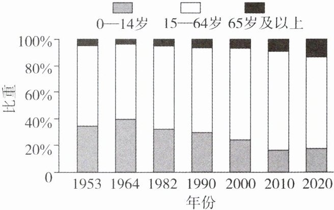 2021 年我国实施一对夫妻可以生育三个子女的政策并配套支持措施。下图示意我国七次全国人口普查的年龄结构(不包括香港、澳门特别行政区和台湾省人口数)。读图,回答 7~8 题。