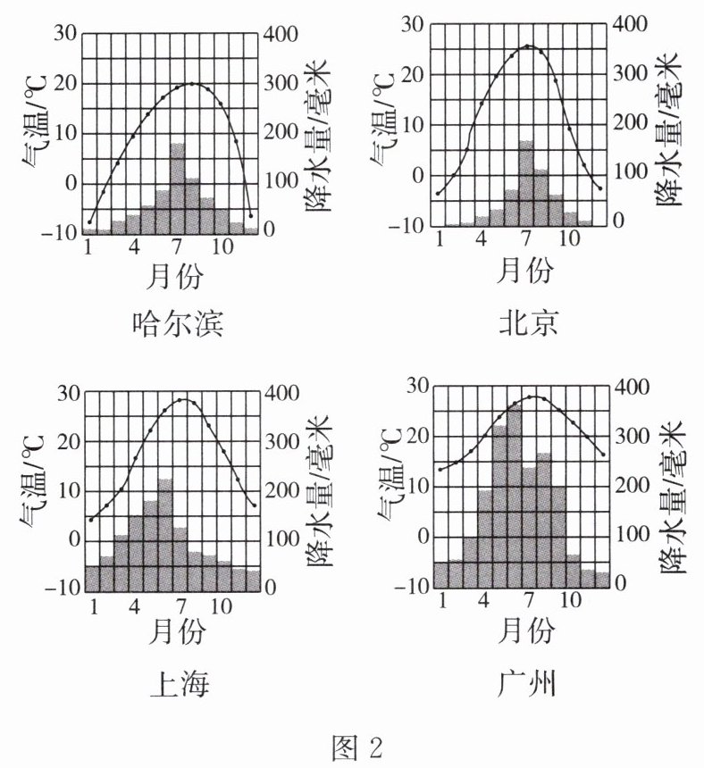 材料二:图1为我国油菜开花日期等值线示意图,图2为哈尔滨、北京、上海、广州多年平均各月气温和降水量图。