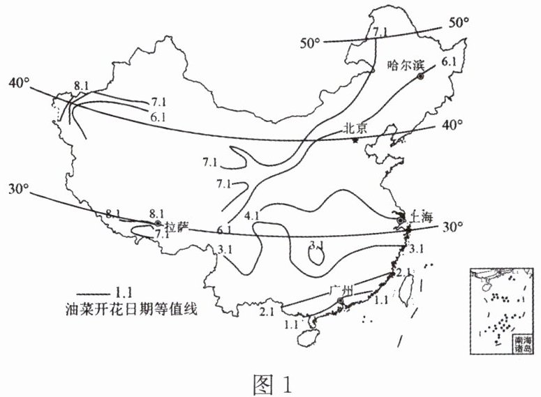 (2)图1中上海和拉萨两地纬度位置相近,两地相比油菜开花日期较晚的是何地?造成两地油菜开花日期不同的主要原因是什么?