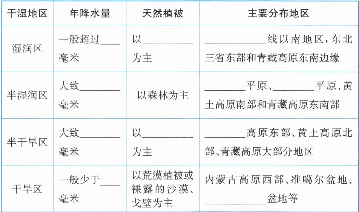 1. 在图中填注四类干湿地区的名称。