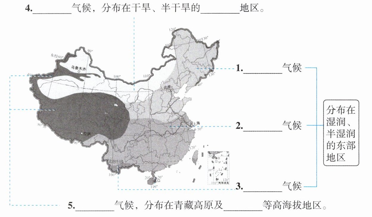 读教科书图2.13,探究我国主要气候类型及其分布。