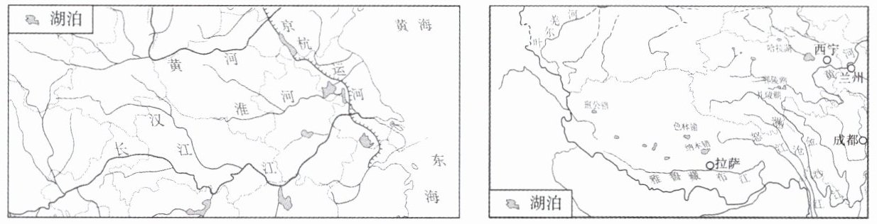 在图中填注鄱阳湖、洞庭湖、太湖、洪泽湖、巢湖、青海湖。