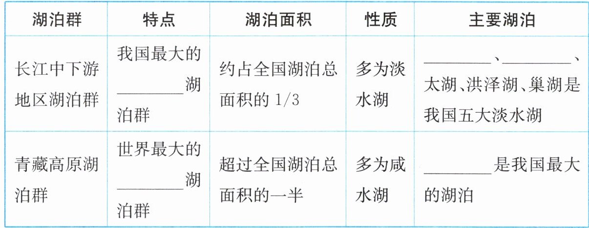 1.众多 广泛 集中 2.从左到右,从上到下:淡水 鄱阳湖 洞庭湖 高原 青海湖