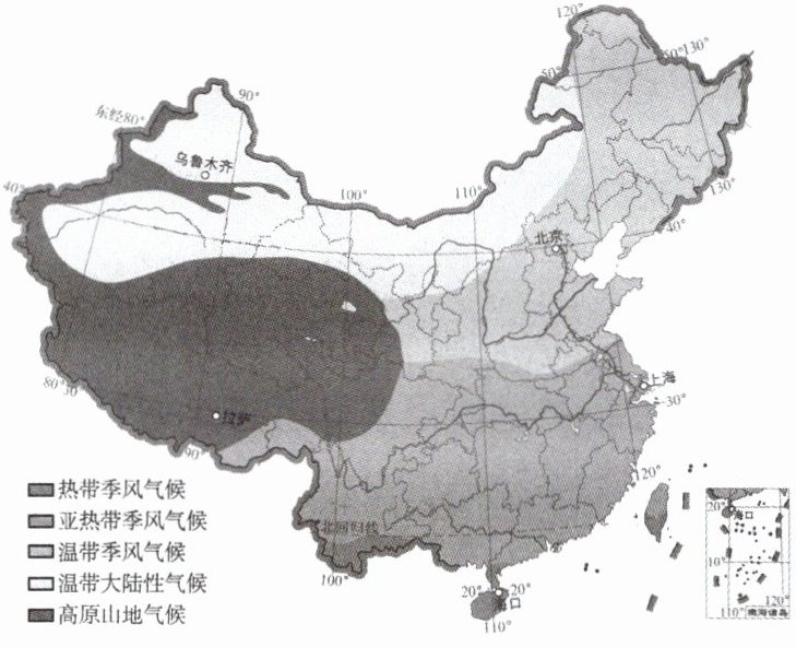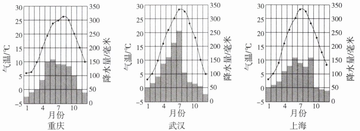 (二)读中国气候类型的分布图和重庆、武汉、上海三地多年平均各月气温和降水量图,认识长江的主要水文特征。