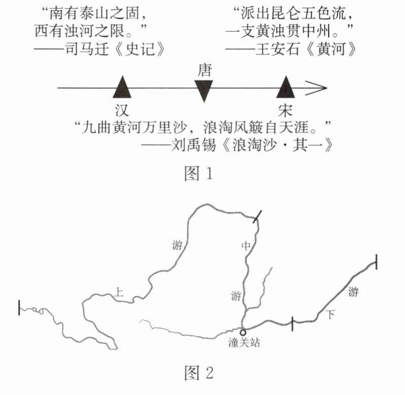 (济南中考)某学校组织了跨学科主题学习,语文、地理老师分别提供了有关黄河的学习资料。图1为“黄河诗文”的时间轴,图2为黄河潼关站位置示意图,表为黄河潼关站水文资料。据此回答 11~12 题。