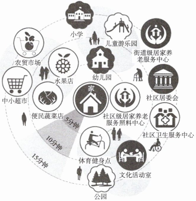 随着人口老龄化程度不断加深,我国将建设 15 分钟养老服务圈,即以步行 15 分钟的路程为半径,不断提升服务圈内社区功能,让老年人在家门口享受多元化的养老服务。读某社区 15 分钟养老服务圈示意图,完成 7~8 题。