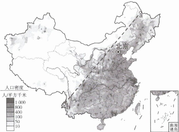 人口分布受社会经济条件、自然条件和开发时间(文明程度)等因素影响。同一社会形态,在一定时期内人口分布有显著的地区差异。读我国人口密度分布图,完成 4~6 题。