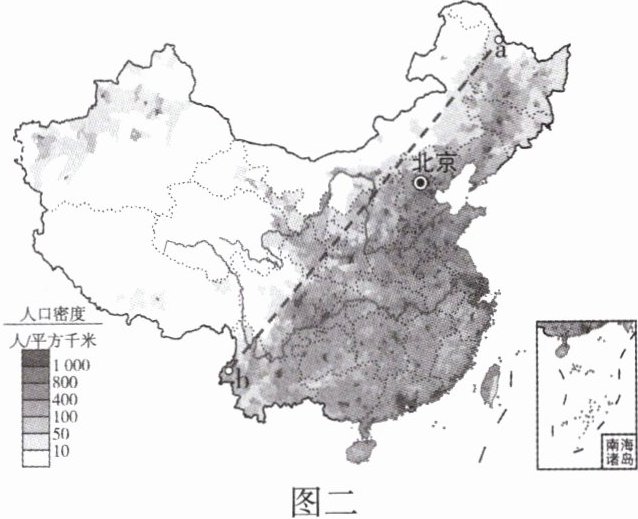 人口分布受社会经济条件、自然条件和开发时间(文明程度)等因素影响。图二是我国人口密度图。