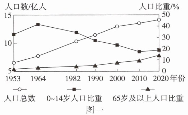 (1)由图一可知,从 1953 年到 2020 年,我国人口总数持续
