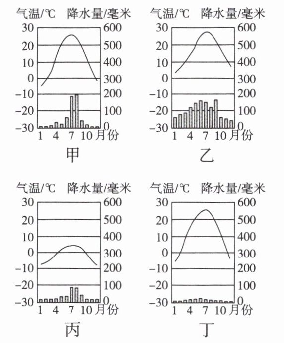(1) 我国柑橘主产区的气温曲线和降水量柱状图最可能是下图中的