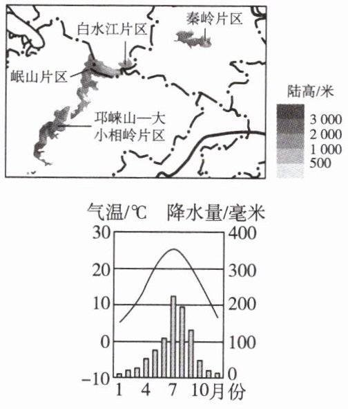 大熊猫国家公园,纵横岷山、邛崃山、大小相岭和秦岭山系,是野生大熊猫种群较集中的地区。箭竹是大熊猫的主要食物,生长在温暖湿润、年降水量1000毫米、海拔1300~2400米的山区。下图为大熊猫国家公园范围图和邛崃山某地气候资料图。