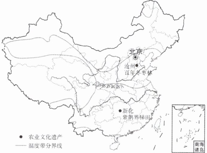 我国拥有丰富多样的文化遗产。读我国部分农业文化遗产及温度带示意图,完成1~2题。