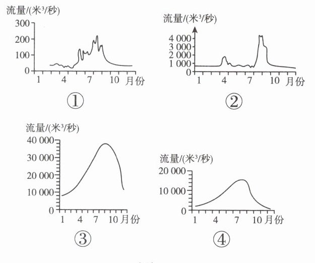 (2)①河:夏季气温高,高山冰雪融水多,形成汛期。②③④河:夏季降水丰富,雨水补给量大,形成汛期。