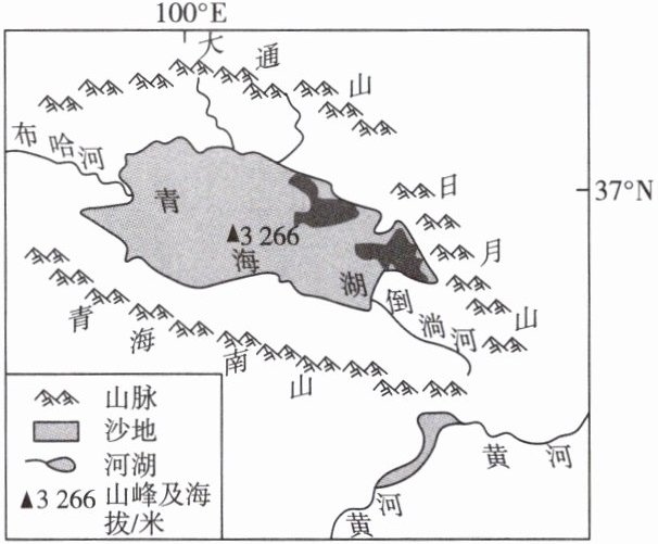 青海湖位于青藏高原东北部,湖面海拔3 196米。20万—200万年前,青海湖形成并与黄河水系相通。13万年前,由于自然环境的变化,青海湖演变为封闭湖泊。近年来,青海湖的水位不断上升。有人认为,500年后青海湖或有可能再次流入黄河,成为我国最大的淡水湖。读青海湖周边环境示意图,完成7~9题。