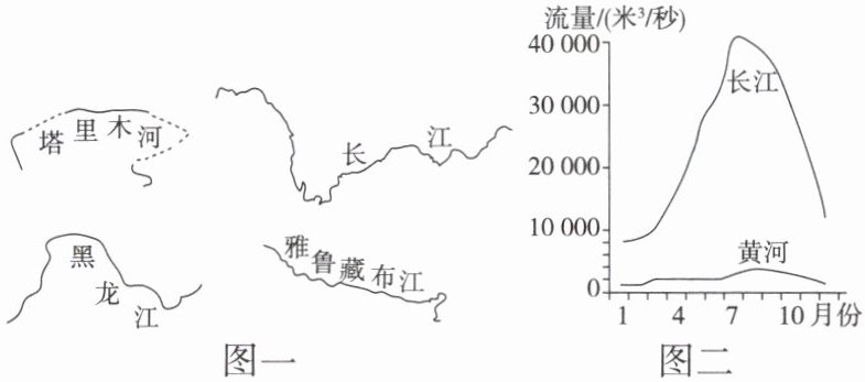 图一为我国四条河流干流示意图,图二为长江径流量年变化曲线示意图,据此完成4~6题。