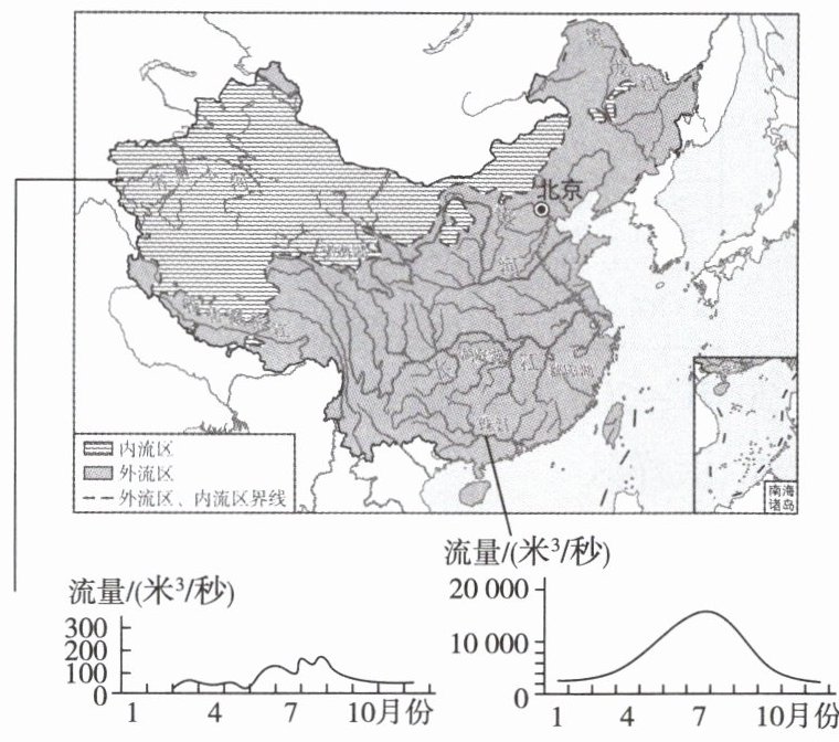 我国河流众多,许多大河源远流长,河流对社会经济发展具有重要意义。下图为我国内、外流区的分布图和塔里木河、珠江流量年变化曲线示意图。