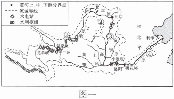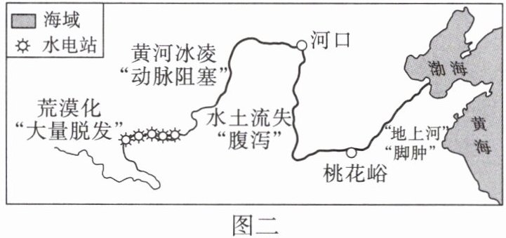 2025年3月19日,黄河内蒙古河段全线平稳开河,标志着2024—2025年度黄河防凌工作顺利结束。图一为黄河水系图,图二为黄河干流的“病症”示意图,据此完成10~11题。
