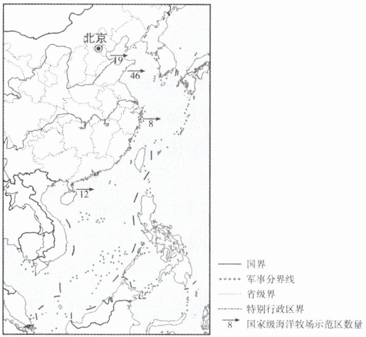 生态系统保护是海洋牧场建设中最容易忽视的一环,可能会因为盲目追求某一鱼类种群数量的增长而严重破坏区域生态系统,造成难以挽回的影响。下图是我国国家级海洋牧场示范区示意图。