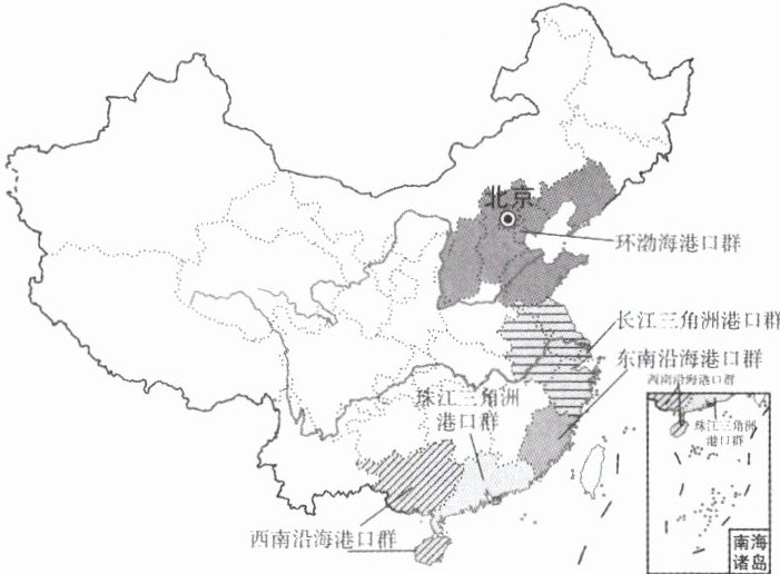 2022 年,我国港口货物吞吐量稳居世界第一。读我国五大港口群分布示意图,完成 4~5 题。
