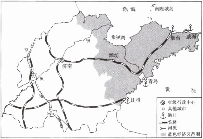 12. 山东半岛蓝色经济区是我国第一个以海洋经济为主题的现代海洋产业集聚区。山东半岛附近海域海洋生物种类多、产量大,风能、潮汐能、海底油气资源丰富。阅读图文材料,回答下列问题。