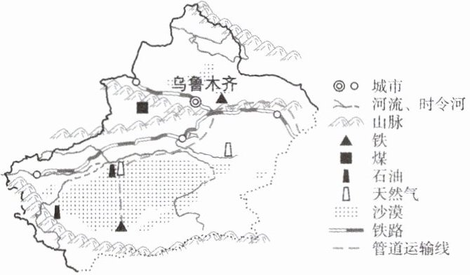 新疆蕴藏了全国40%的煤炭、39%的天然气、36%的石油,是我国的能源资源中心。新疆的煤田具有埋藏较浅、煤层多且厚度大、单位面积产能高的特点。变输煤为输电,把新疆的资源转换为电力,打造“煤从空中走、电送全中国”的“电力丝绸之路”,是新疆参与全国能源资源的优化配置,实现经济跨越式发展的关键。下图为新疆维吾尔自治区简图。