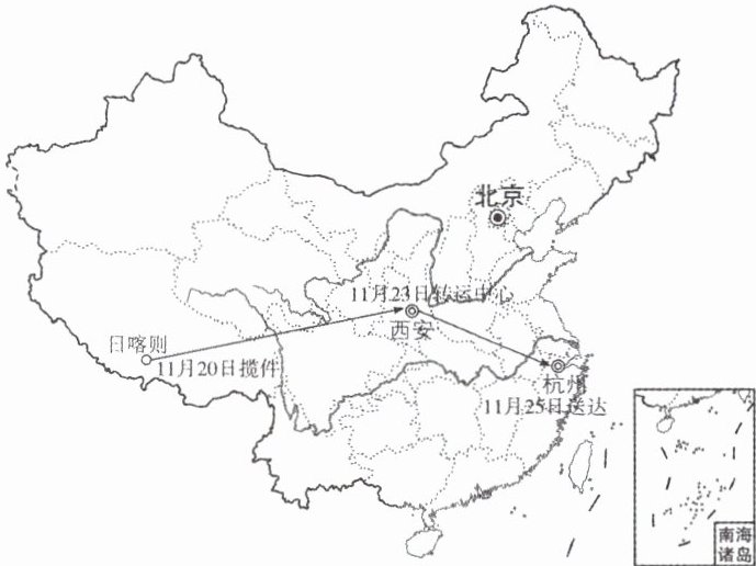 电商助力乡村振兴,网销促进农民增收。2024年11月20日,西藏自治区日喀则市南木林县艾玛乡的村民旺布收到了来自浙江省杭州市桐庐县芦茨村民宿老板王先生订购土豆的电子订单。11月25日,王先生收到了订购的土豆。读土豆运输时间及路线示意图,完成6~7题。