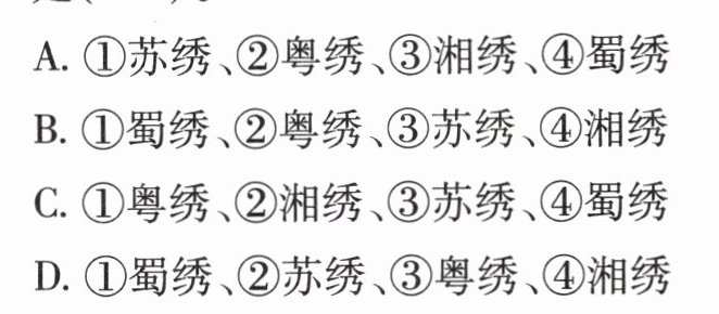 )。A. ①苏绣、②粤绣、③湘绣、④蜀绣