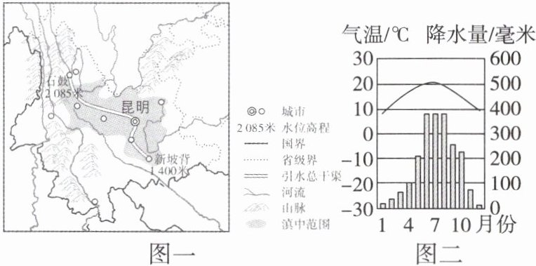 10. 滇中引水工程是增进民生福祉的省级重点项目。该工程从金沙江虎跳峡河段引水,通过干支并用,以干强支,有效缓解滇中地区水资源供需矛盾,改善河道和高原湖泊的生态及水环境状况。结合滇中引水工程路线示意图(图一)和昆明气候资料图(图二),回答下列问题。