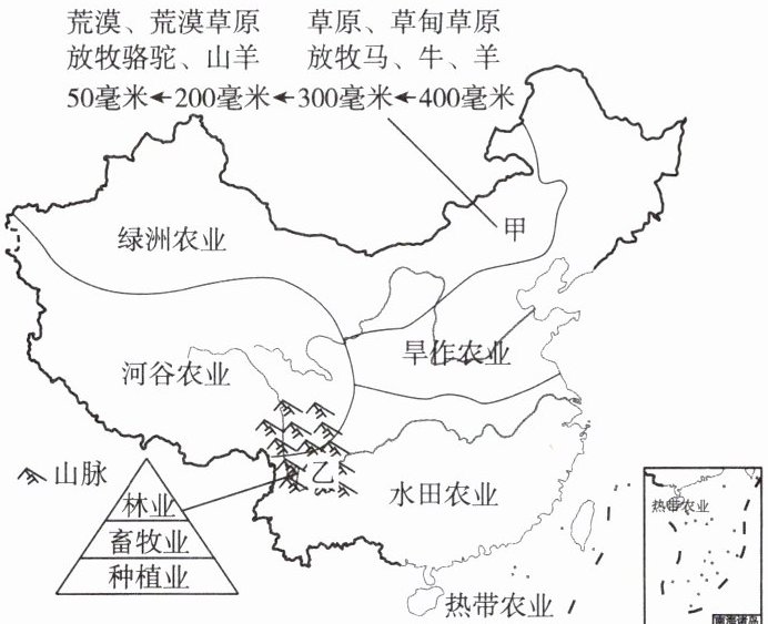 1. 图中甲区域自东向西放牧的牲畜种类不同,主要是受(
