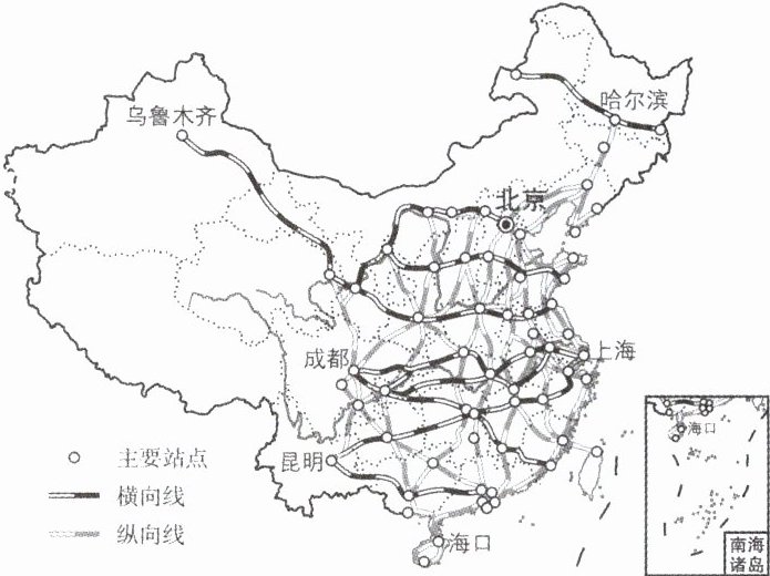 “双十一”期间,为了全面提升物流速度,铁路部门开启了“高铁带货”模式。与过去的铁路货运相比,高铁快运定时定点发车,能更好地保证货物运达时效。下图为我国中长期高速铁路网规划图。