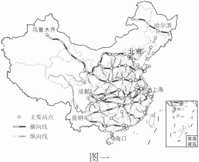 材料一 2024年9月14日,我国铁路营业里程突破16万公里。图一为我国中长期高速铁路网规划图。