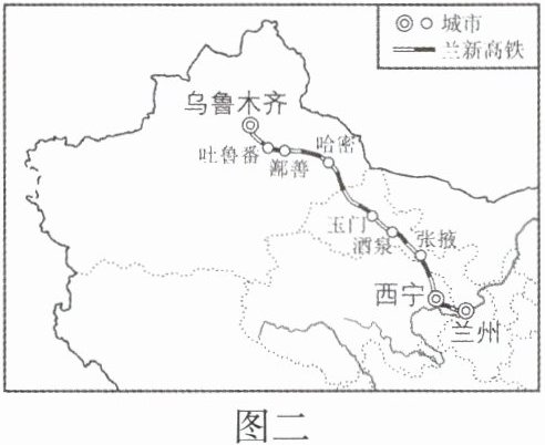 材料二 兰新高铁穿越了我国西北地区和青藏地区,是我国首条在高海拔地区修建的高速铁路。图二为兰新高铁示意图。