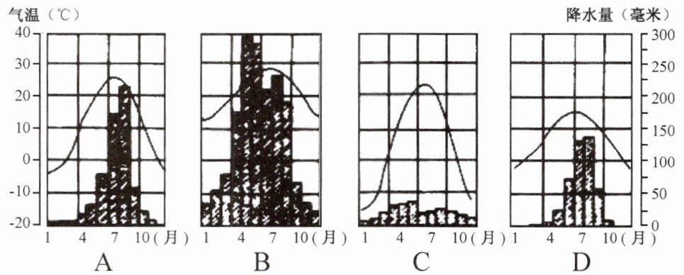 5. 亚热带季风气候的特点是夏季高温多雨,冬季温和少雨,下列哪幅图描述正确? (
