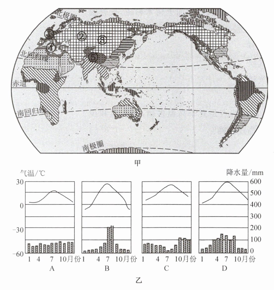 。(海陆位置/纬度位置/地形地势)3. (双选)甲图中序号所在地的气候类型与乙图中的气候资料图搭配正确的是 (