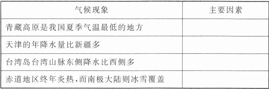 2. 气候现象 主要因素 青藏高原是我国夏季气温最低的地方 地形(海拔/地势) 天津的年降水量比新疆多 海陆 台湾岛台湾山脉东侧降水比西侧多 地形 赤道地区终年炎热,而南极大陆则冰雪覆盖 纬度