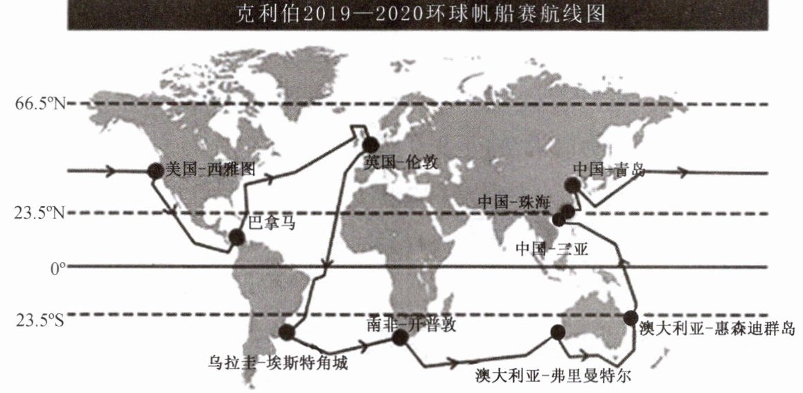 克利伯环球帆船赛是世界上最著名的业余环球航海赛事之一。2019—2020 环球帆船赛从英国启航,途经多个地区,最终于 2022 年 7 月 30 日(因疫情休赛一段时间)完成环球航行。我国的“青岛号”获得该赛季总冠军。下图为克利伯 2019—2020 环球帆船赛航线图。读图完成 15—18 题。